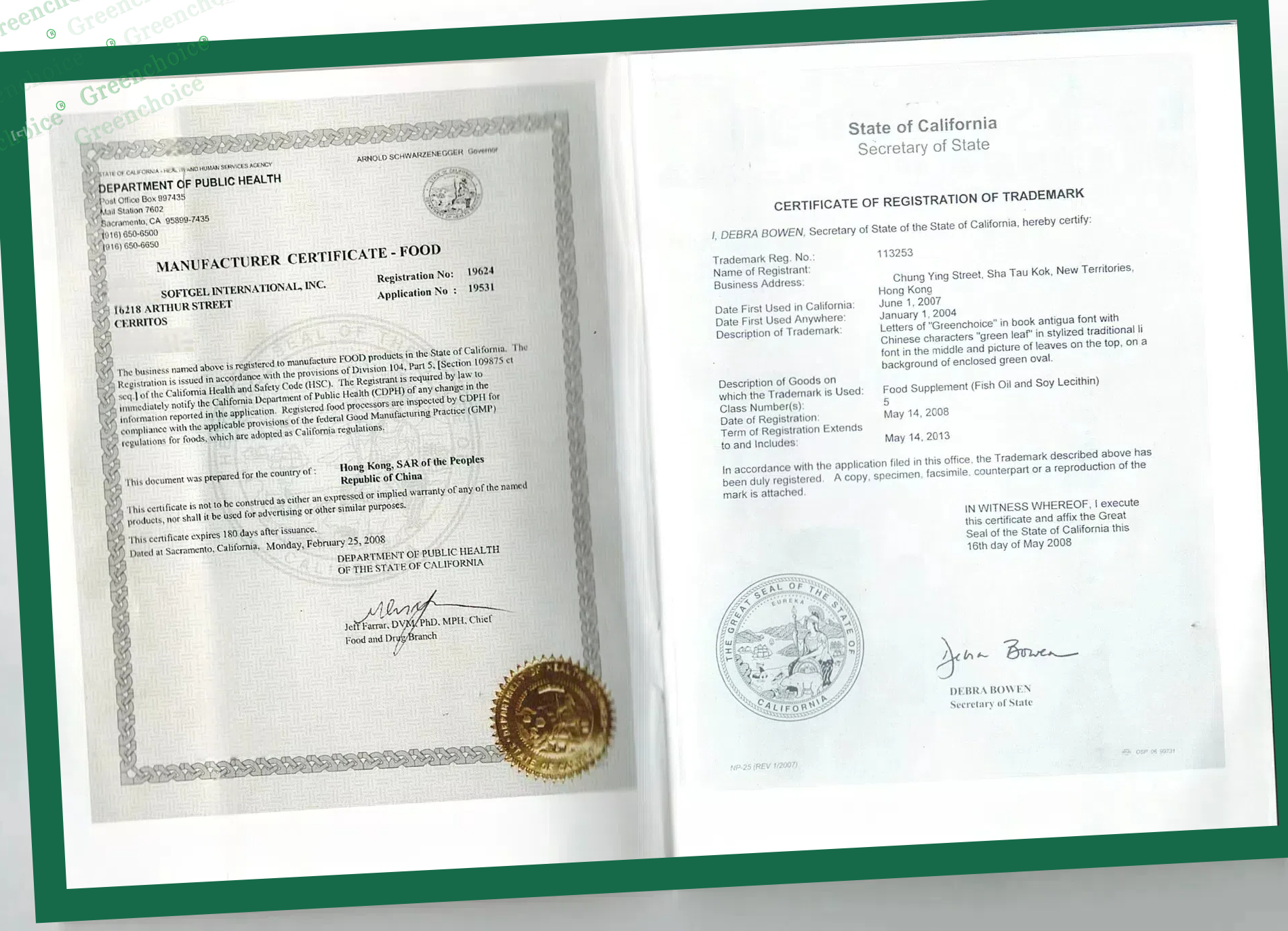 美国生产证(符合出口资质)/ 美国GREENCHOICE绿叶商标证书 香港新界中英街免税区首家实体店,摄于2001年